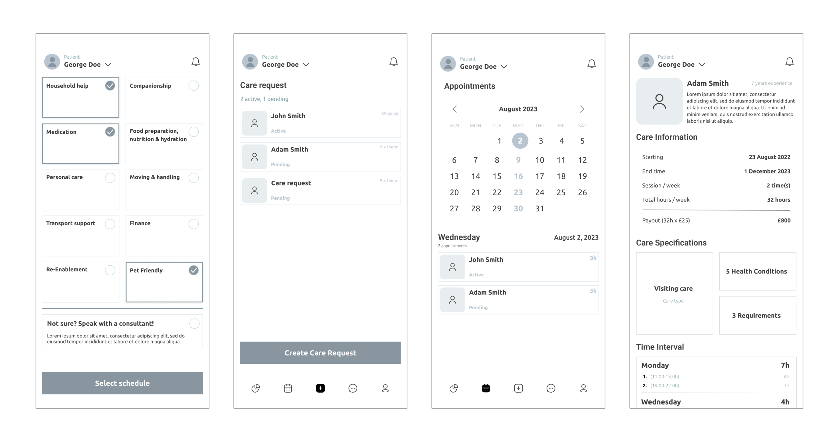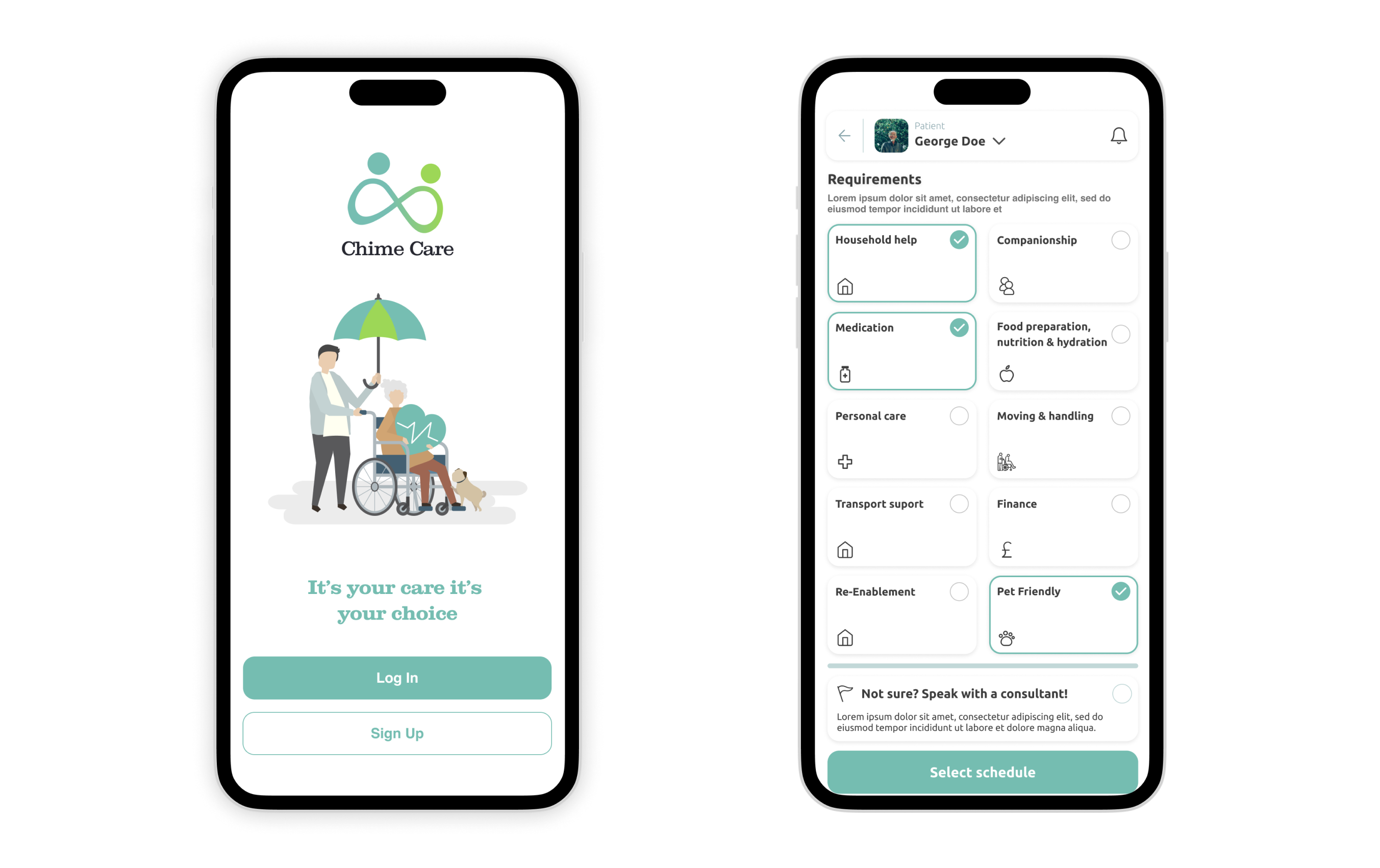 Chime Care, a UK-based company, approached us with the vision to create a user-friendly app that simplifies the process of care management for elderly individuals. The app's primary focus is to offer an easy sign-up, transparent appointment scheduling and comprehensive analytics. Chime Care aims to bridge the gap between caregivers and concerned family members, allowing them to stay closely connected to the daily lives of their loved ones.