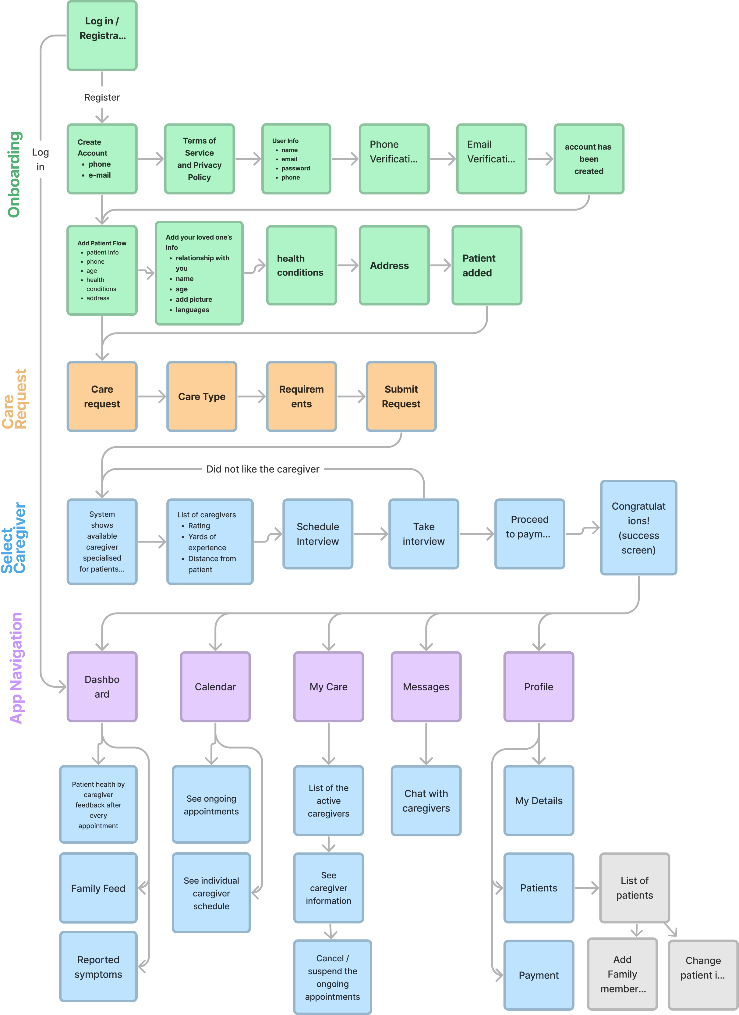 User Flow Mapping: Comprehensive user flow diagrams were created to visualize the journey of customers and caregivers within the app ecosystem.